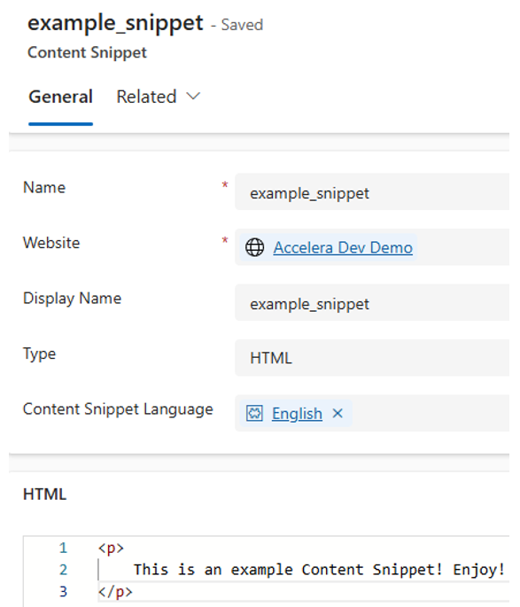 Content Snippets are key-value pairs. The key is the name of the content snippet. This is the name that will be referenced in your code if needed. The value is the markup (text, HTML, or JavaScript) that will be implemented across your site. Think of them as placeholders that define content once and use it in multiple locations.
